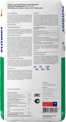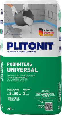 Ровнитель PLITONIT Universal - 20 быстротвердеющий, самовыравнивающийся 20 кг 7489 предназначен для выравнивания и корректирования бетонных полов и монолитных цементных и полимер-гипсовых стяжек, внутри сухих и влажных жилых (конторских) помещений, под укладку напольной керамической плитки, выстилающих покрытий, паркета и использования в системе «теплый пол». Возможна эксплуатация во влажных помещениях. Температура покрытия в процессе эксплуатации от +5°С до +50°С. Рекомендуемая толщина слоя выравнивания от 2 до 80 мм (в углублениях до 100 мм). Не подлежит окраске и использованию без напольного покрытия. Максимальная фракция наполнителя 1,25 мм.