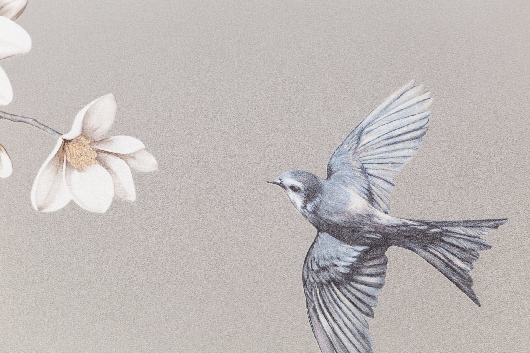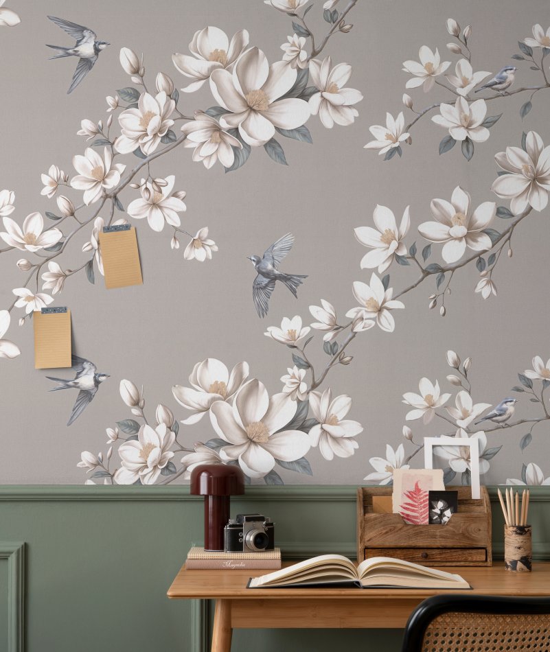 Авантажную тему обоев Magnolia составляют изящные соцветия магнолии и веселое щебетание порхающих в воздухе птиц – весенний мотив, который наполнен светлой радостью от пробуждения природы.