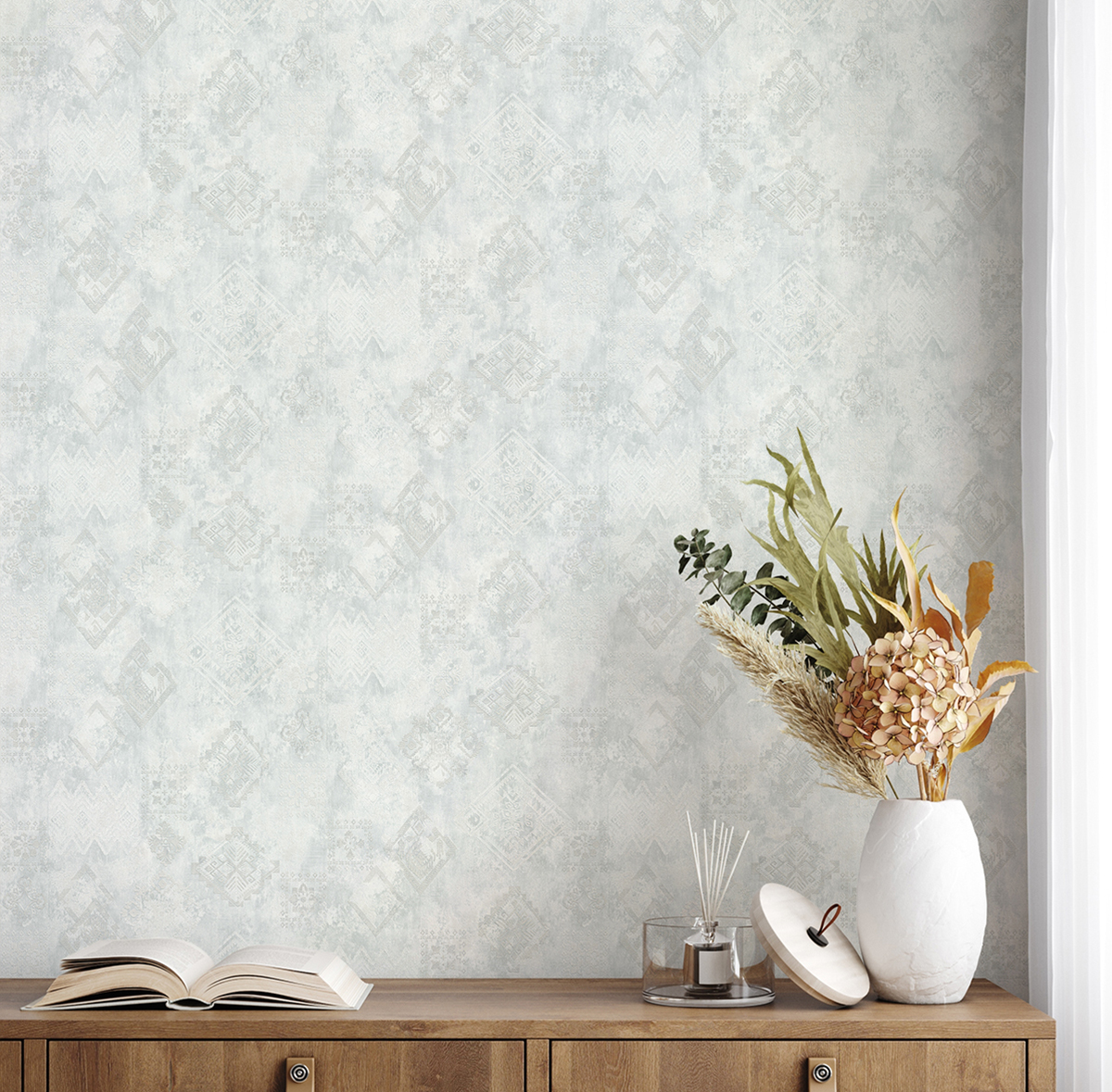 Современная классика с восточным акцентом — это матовая текстильная фактура, переплетённая с эффектом декоративной штукатурки, и изысканные марракешские узоры, которые никогда не выйдут из моды. На основной орнамент деликатно нанесены интерферентные краски, создающие мягкое мерцание и живую игру оттенков при разном освещении.