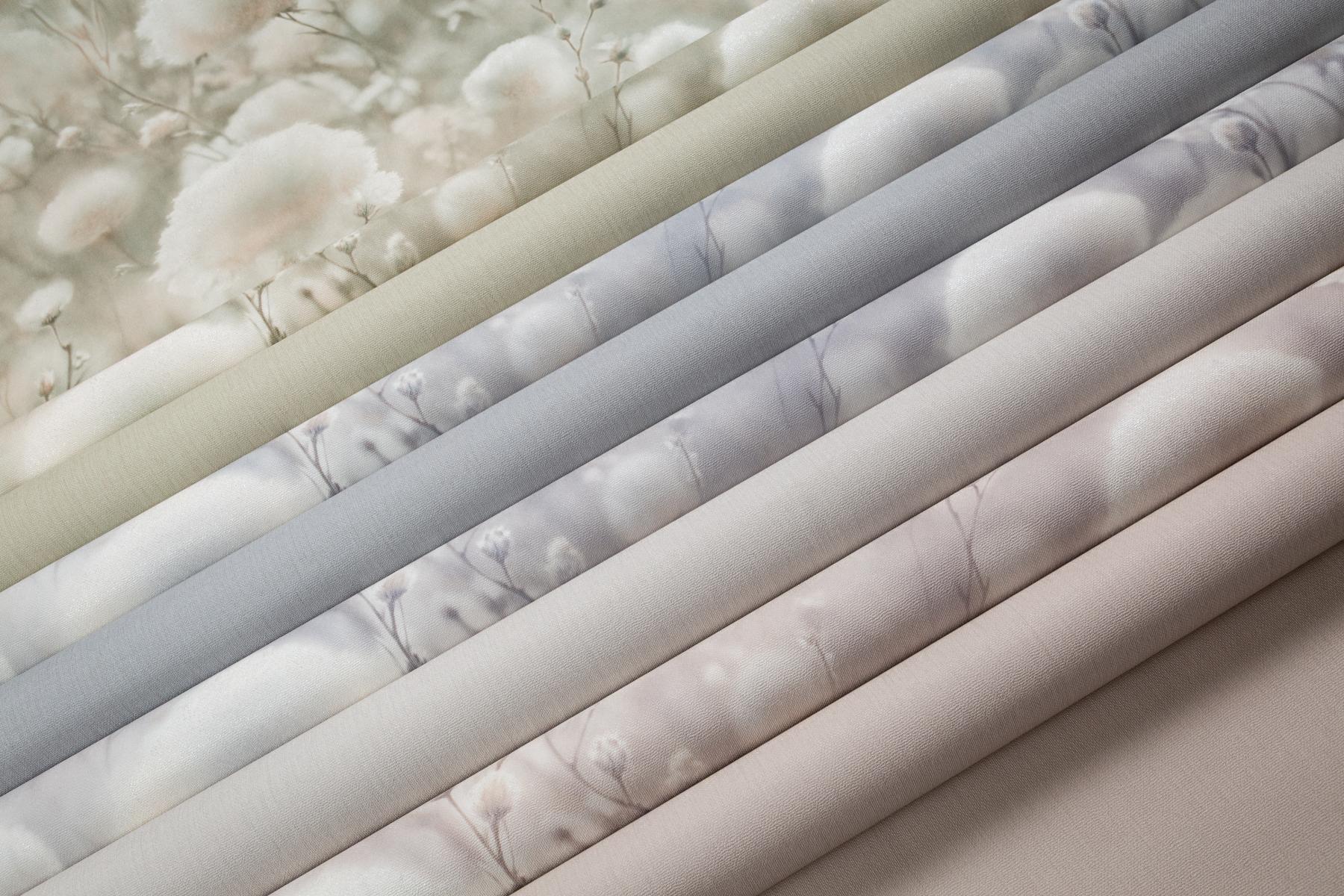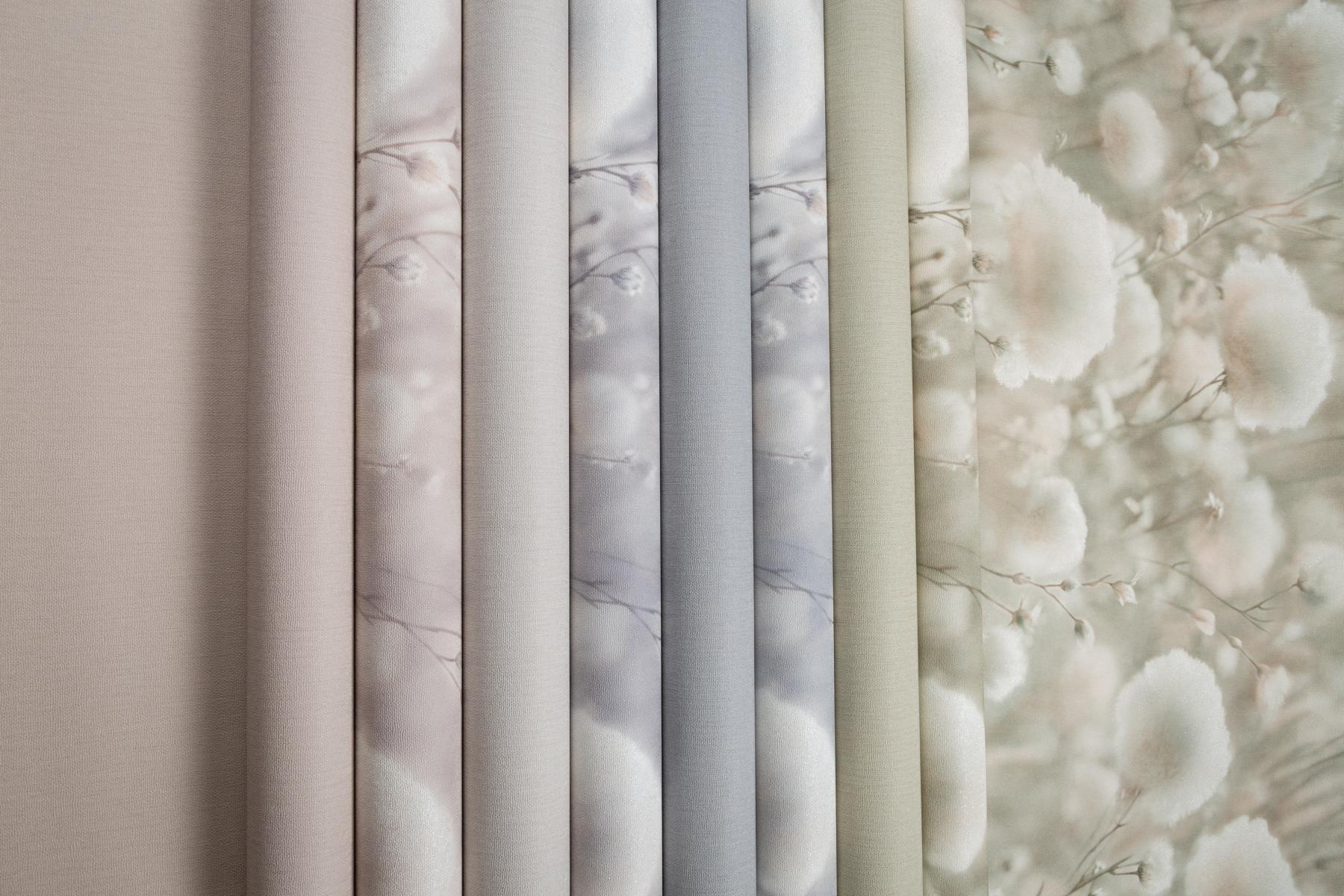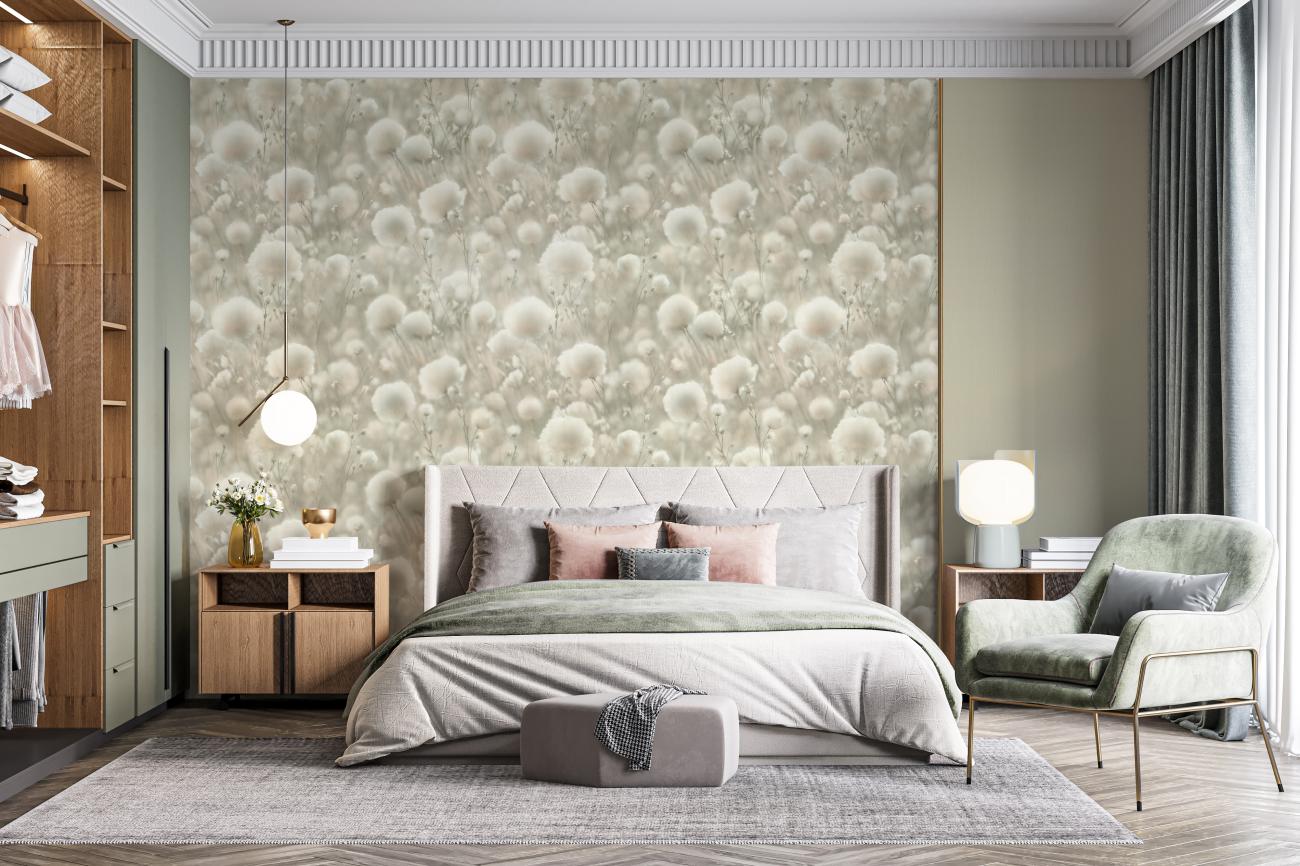 Воздушные соцветия хлопка, окутанные туманной дымкой, наполняют интерьер домашним уютом. Теплый пушистый мотив дышит нежностью летнего утра. Многоплановый рисунок Cottonia отрисован с фотографической точностью и создает эффект единого панно.